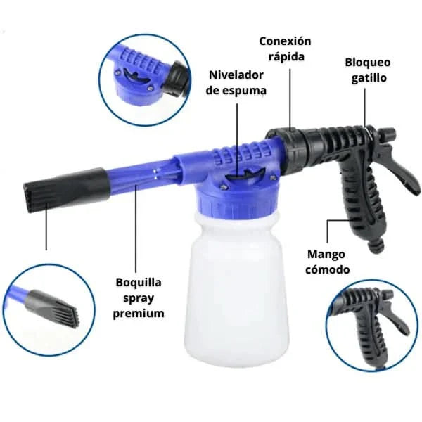 ✨ Características ✅ Material: plástico resistente ✅ Depósito para jabón/limpiador integrado ✅ Ajuste de espuma y caudal desde el gatillo ✅ Múltiples patrones de rociado (chorro, abanico, niebla, etc.) ✅ Conexión estándar a manguera (sin herramientas)